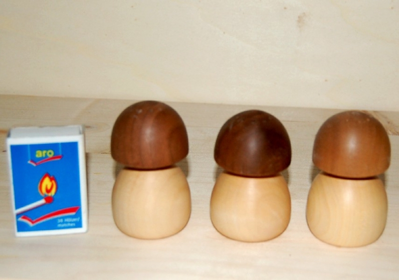 Attraktiver Salzstreuer in Pilzform, 6 cm hoch. Der Hut ist aus Nussbaum, der Stiel aus Ahorn. Die Behandlung des Holzes mit Danish Oil gewährleistet dauerhaften Schutz und ist gleichzeitig völlig unbedenklich. Das leichte Neubefüllen gewährleistet ein Stopfen im Boden.