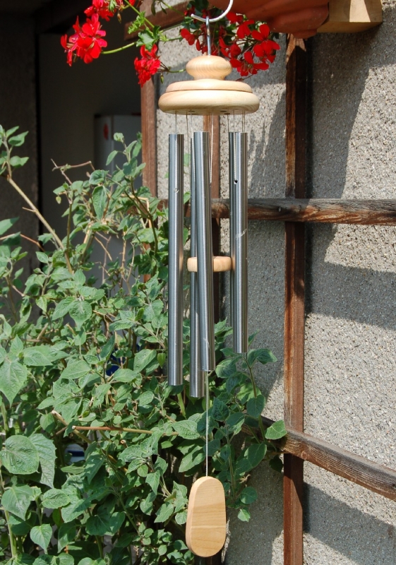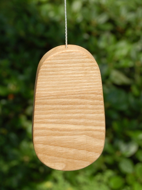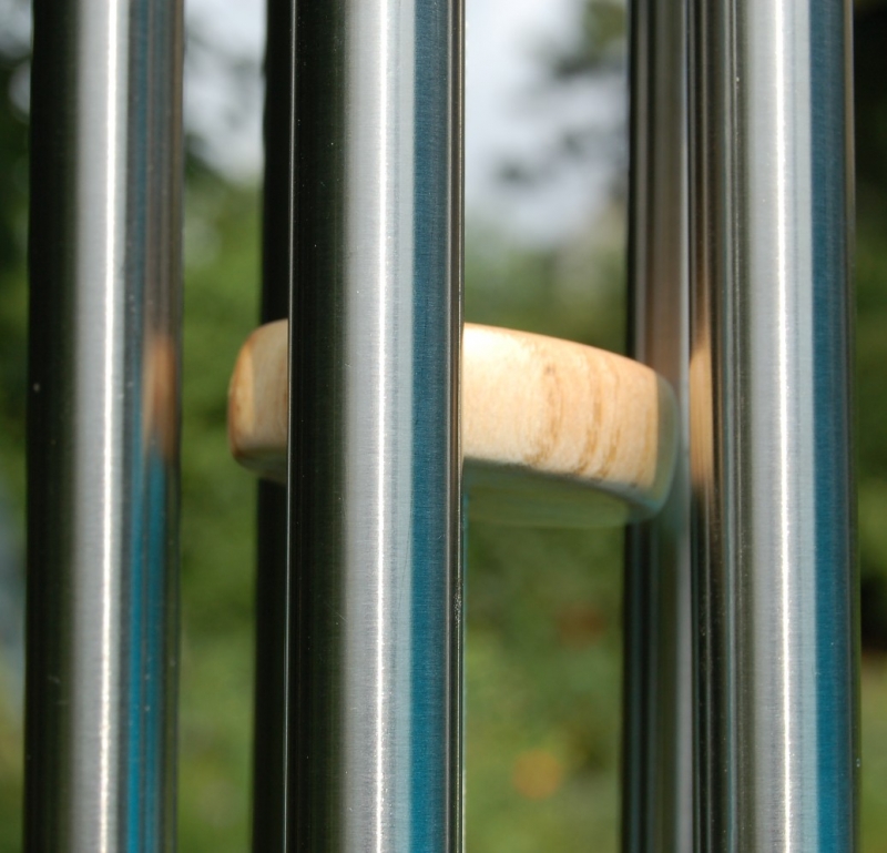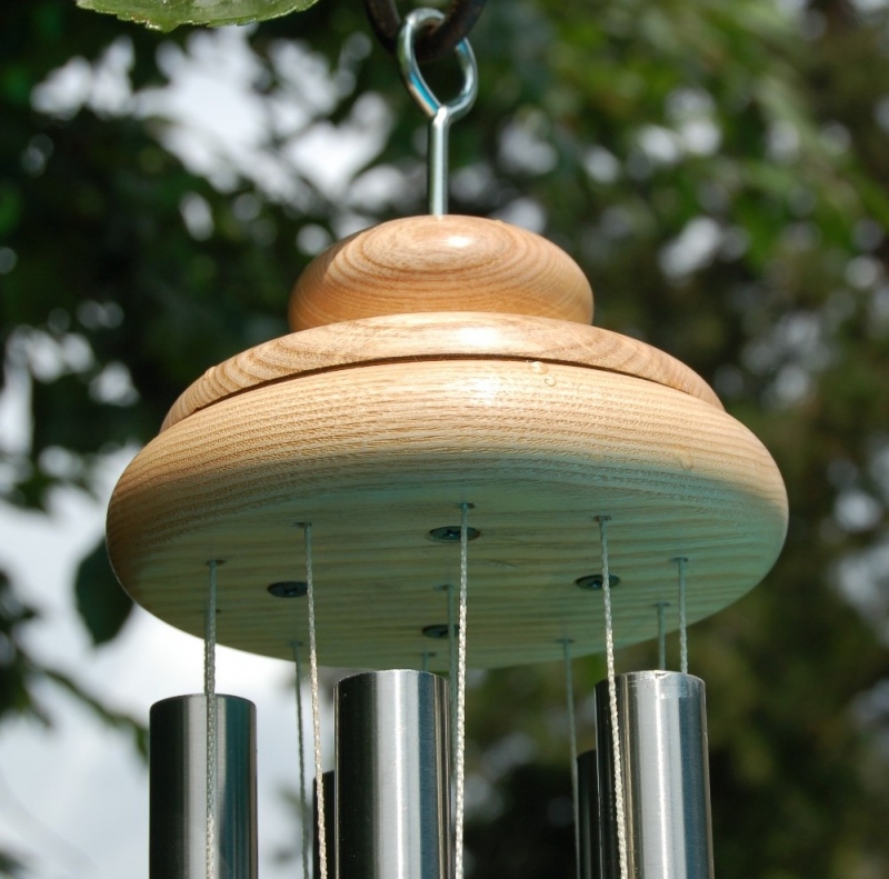 Windspiel mit 5 Tönen aus Esche für innen und außen. Die Stäbe sind aus Edelstahl mit dem Durchmesser 20 mm und Längen zwischen 26 und 35 cm. Die Gesamtlänge vom Aufhängehaken bis zum Pendel beträgt 70 cm, der Durchmesser des Baldachins 13 cm.