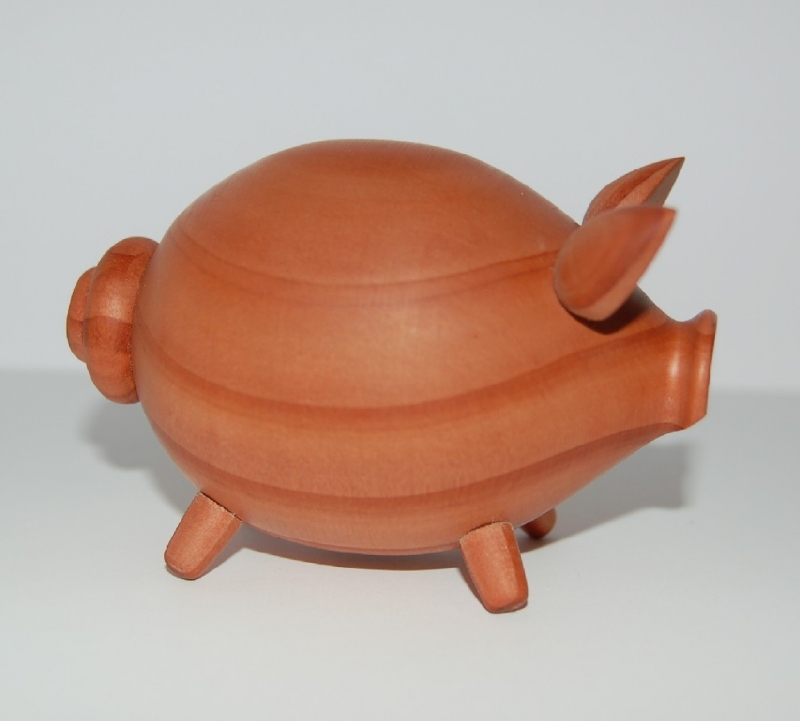 Schweinchen als attraktiver Salzstreuer aus dem Holz des Riesenmammutbaumes. Das wertvolle Holz stammt von einem Baum aus Eppan in Südtirol, der von einem Blitz gefällt wurde und als Feuerholz für den Kamin dienen sollte.
